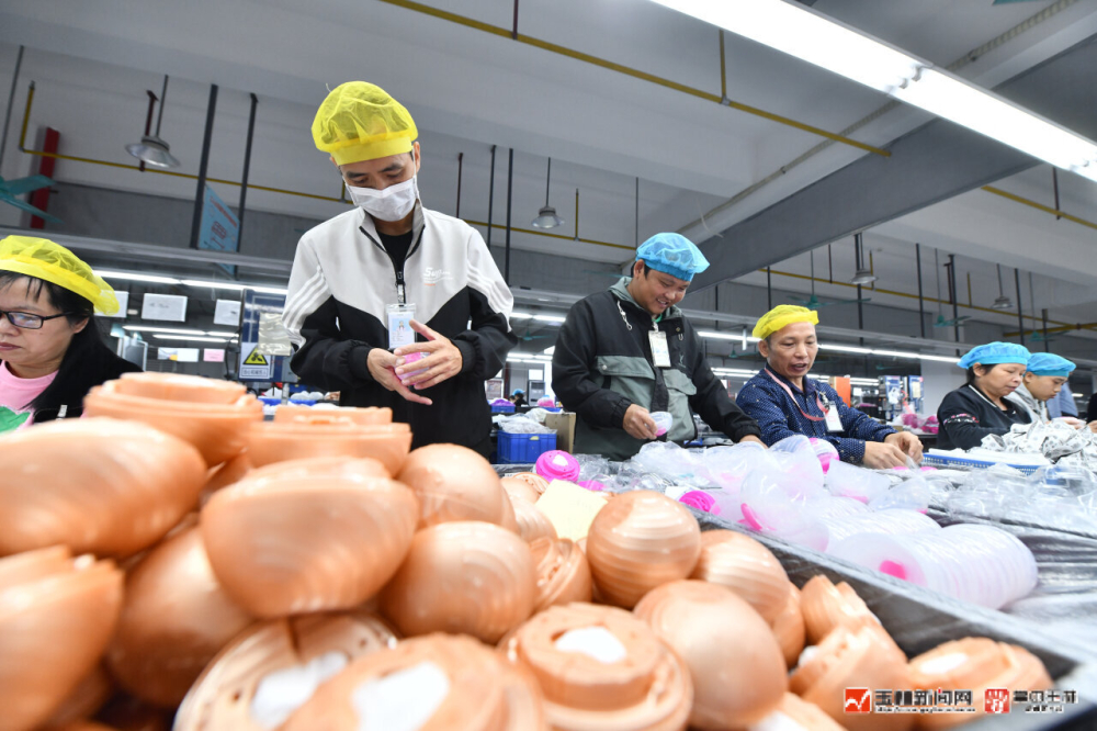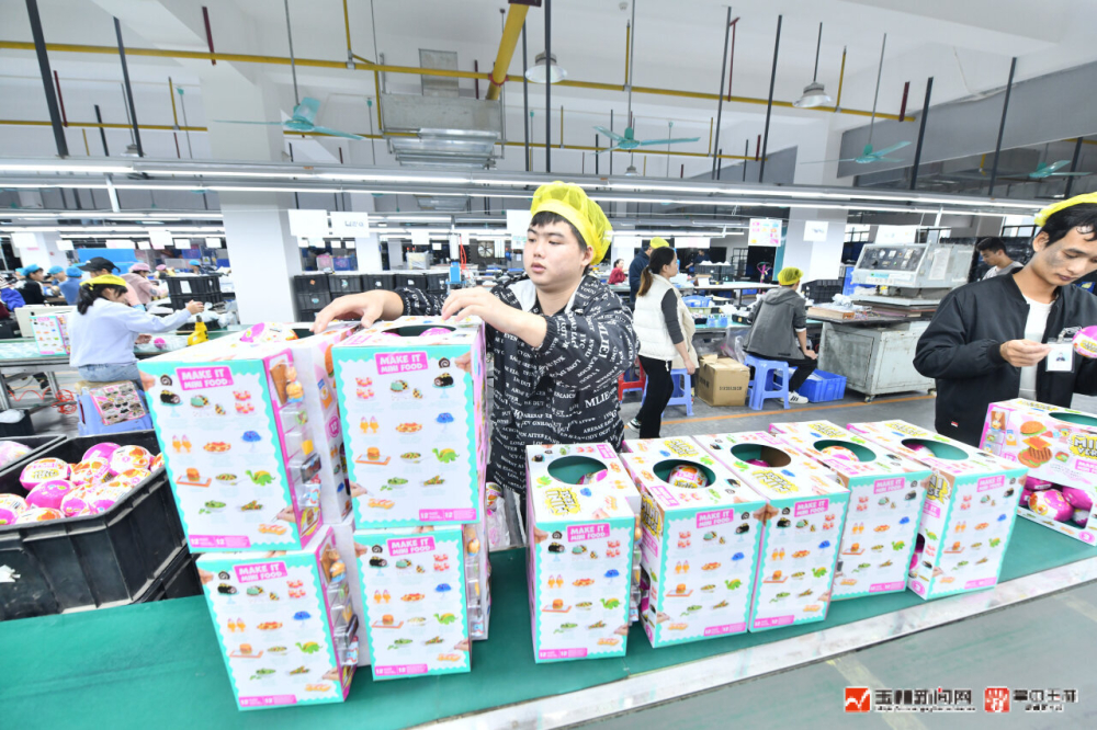 北流市“玉商回归产业园”一家玩具生产企业,工人在生产线上作业。