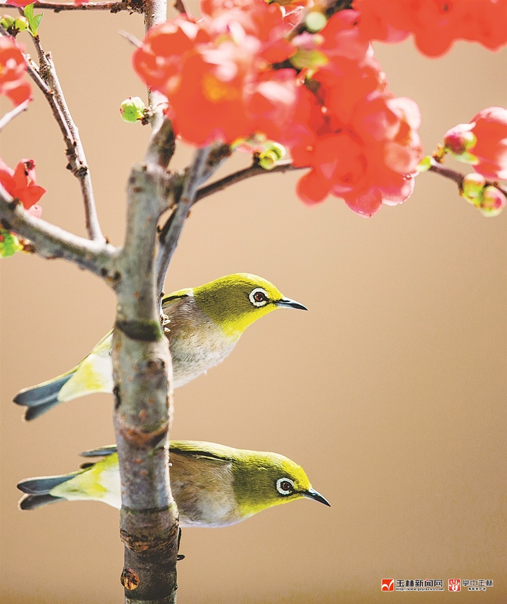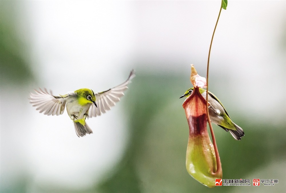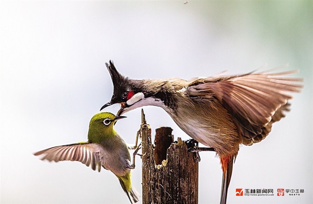 “这样就可以很好地捕捉鸟儿飞翔的动态。”庞甲章深有感悟地说,鸟最美的瞬间莫过于飞翔的姿态,如今他将相机放在角度最适合、光线最佳的位置,就能够最大程度地拍出好照片。一根根羽毛清晰可见,翅膀如花瓣一样张开,美得难以言语。最可贵的是连鸟都似乎有了表情,“你看看这张!”庞甲章翻出他的一幅得意之作:两只鸟分立竹根两侧,右边的大鸟是红耳鹎,头上竖起的毛发显得气势汹汹,将嘴张开似是要啄向小鸟的头;左侧的小鸟是暗绿绣眼鸟,翅膀虽然张开,但大眼睛里满是茫然惶恐。庞甲章对这幅作品很是满意,取名为“吓唬”。