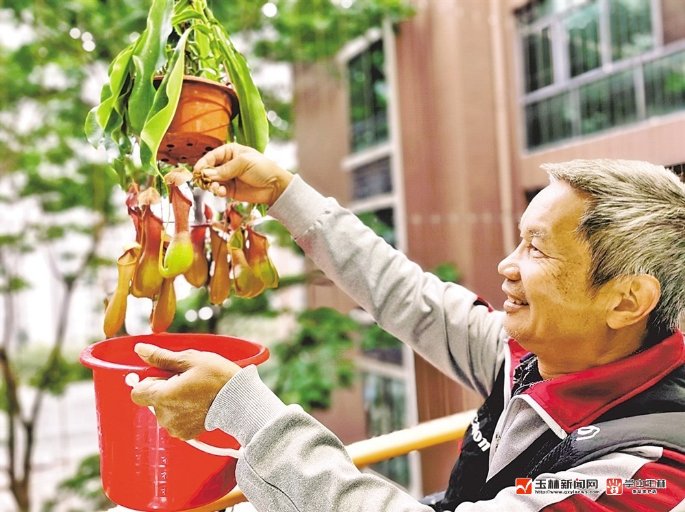 庞甲章在自家阳台的植物上投放小鸟喜欢吃的虫子,吸引小鸟前来进食。 (本报记者 蒋金泰 摄)